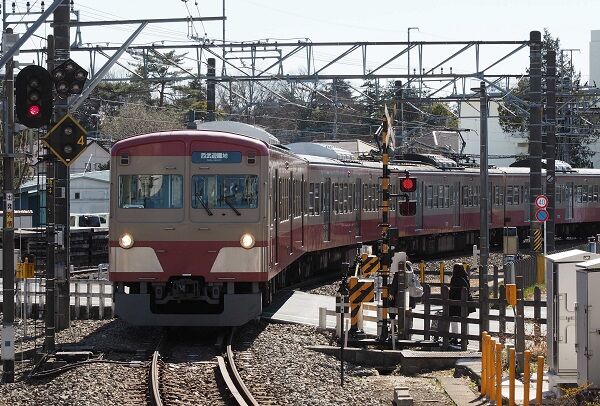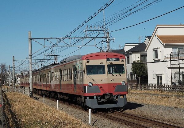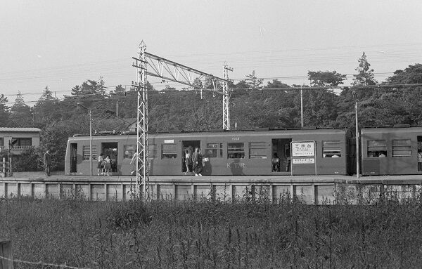 本線を走る吉祥寺行き。先頭の窓上のサボは「この車両は神泉でドアが開きません」という注意書きになっています。当時、旧型の4連は吉祥寺寄りの1両が孤立しないように編成を組まなければならないという制約がありました。