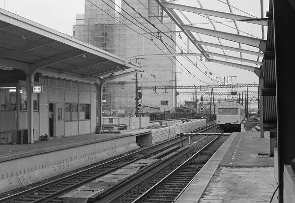 中野を通過するDC急行、昼間の列車だから「アルプス」でしょう。緩行上り線との間に渡り線があります。もっと昔は快速下り線との間に中線があり、これを本線にして快速のホームが拡幅されました。左の建屋との隙間がかつての本線の跡になります。