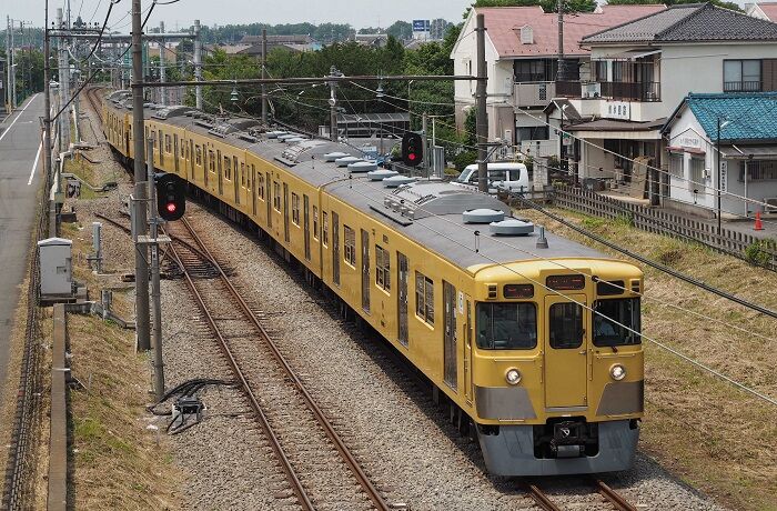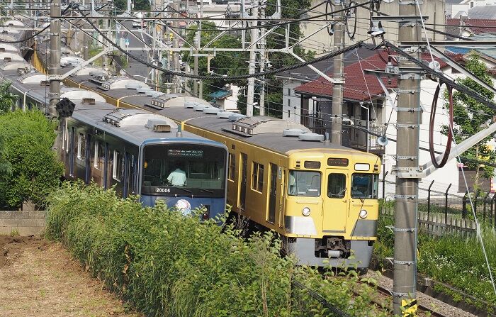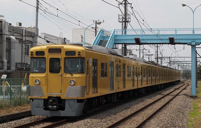 2000系の田の字窓車は屋根にグロベンが乗っています。モハ63以来お馴染みのやつで、モハ90の量産車がグロベン乗せて出てきた時のガッカリ感は、今でも忘れられません。そんなグロベンも今や絶滅危惧種の仲間入りして、首都圏で見られるのはこの田の字窓車だけ(だと思う)。ならばグロベンがはっきり見えるようなアングルで撮れる場所はどこかと1週間考え、6月7日の午後、東伏見~西武柳沢間の横断橋に来てみました。
