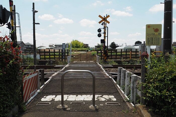 小川~東大和市間の小川9号踏切。1日に来た12号踏切の少し手前で、条件はこちらの方がよいのですが、前回は三脚を立てた先客がいたので諦めました。渡った左側は自動車教習所、右側は栗の木が植わっています。多摩地区は栗の栽培が結構盛んなのです。電車を待つ間は日陰に入れるのがありがたい。