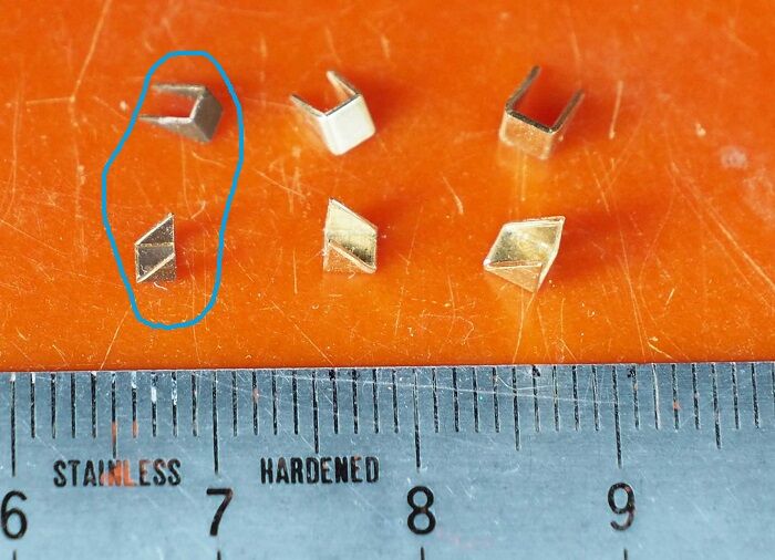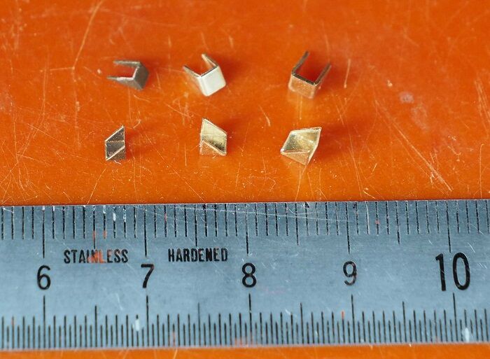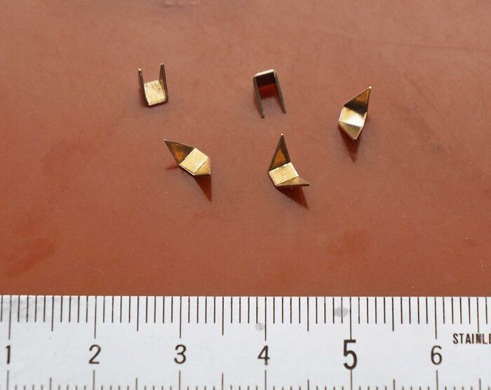 細めに整形したら0.4mmの板をアングル状に曲げたベースにハンダ付け。左右はニッパーで斜めに切落とします。