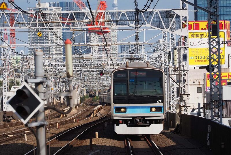 快速ホームの先端から。夏の15時過ぎになれば、側面にも陽が回ります。今はホーム延長工事中ですが、グリーン車が入って12連になれば手前の柵はなくなり、もう少しすっきりした絵が期待できます。