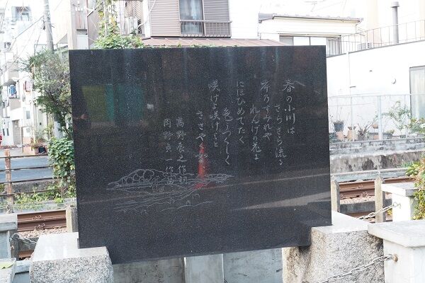 上の写真の木立のところにこんな石碑があります。童謡「春の小川」はここから生まれました。