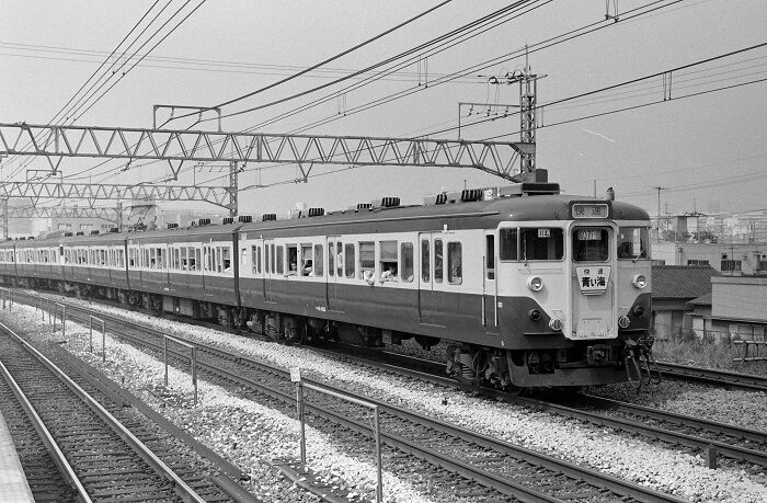 中央線市ヶ谷~四ッ谷間。まだ日中の快速運転は行われていない。架線柱はほとんどが木柱です。