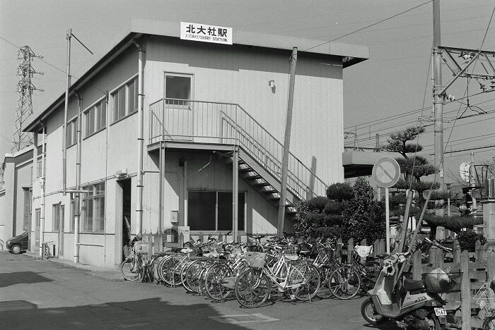 場所は桑名駅構内の外れ、今の北勢線西桑名のあたりだと思います。左にいるのは国鉄の貨車でカ1584、右の小さいのが北勢線の貨車、両者が接近しているから、ここで積み荷の積換えを行っていたのでしょう。さらによく見ると、北勢線のワが止まっている部分はトラバーサーになっているので、積換えの時は数m左に移動して国鉄の貨車に接近できるわけです。この時代の北勢線に定期の貨物列車は運転されていなかったと思いますが、不定期に使用されることはあったのでしょう。かつては貨物ホームの上に屋根もかかっていたようで、その柱だけが残っています。